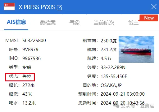 由于故障,X-PRESS PYXIS轮无法依靠自身动力完成航行,随后被拖往日本横滨港,并于9月17日抵达横滨港。