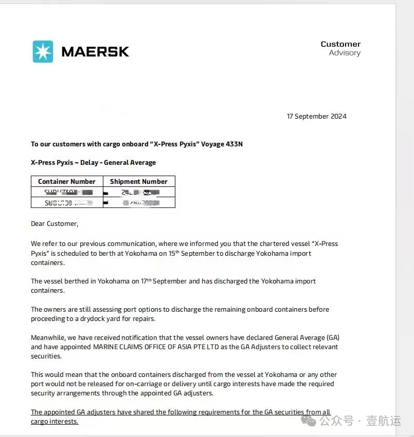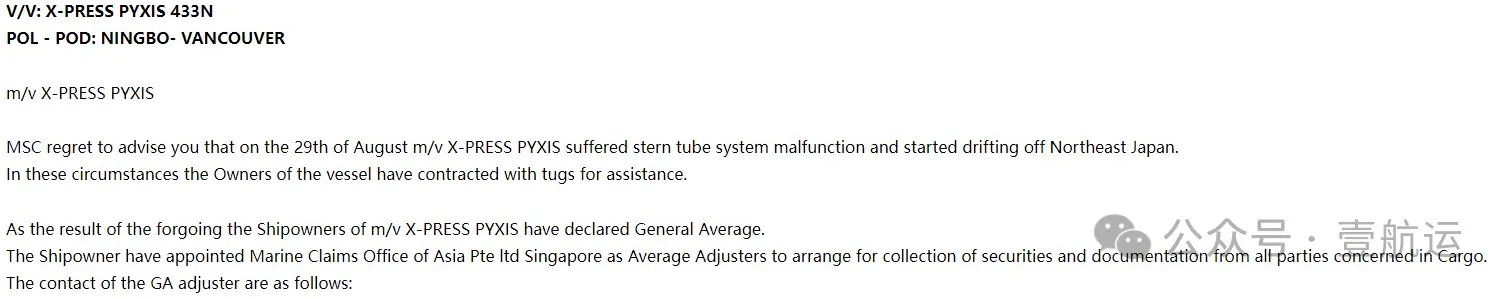 X-PRESS PYXIS轮共舱船公司MSC和马士基向客户发出通知,称已收到通知,X-PRESS PYXIS轮船东已宣布共同海损(GA),这让大量货主货代企业措手不及!