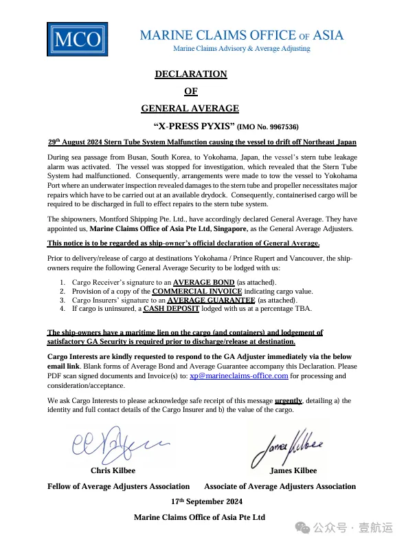 一艘服务于2M联盟北美航线的集装箱船X-PRESS PYXIS轮因艉管系统故障宣布共同海损,导致大量货主和货代企业受到影响。该船于8月29日在日本东北部海域漂流,船东已与拖船签订援助合同。MSC和马士基已通知客户,要求在横滨或其他港口卸下的集装箱在货物利益方通过指定的GA理算员作出必要的安全安排之前不得放行。保险公司通知显示,船舶的艉管系统出现故障,导致船舶无法依靠自身动力完成航行,需进行重大修理。X-PRESS PYXIS轮挂靠多个中国港口,船期严重延误,共同海损的宣布将影响大量货主和货代企业。